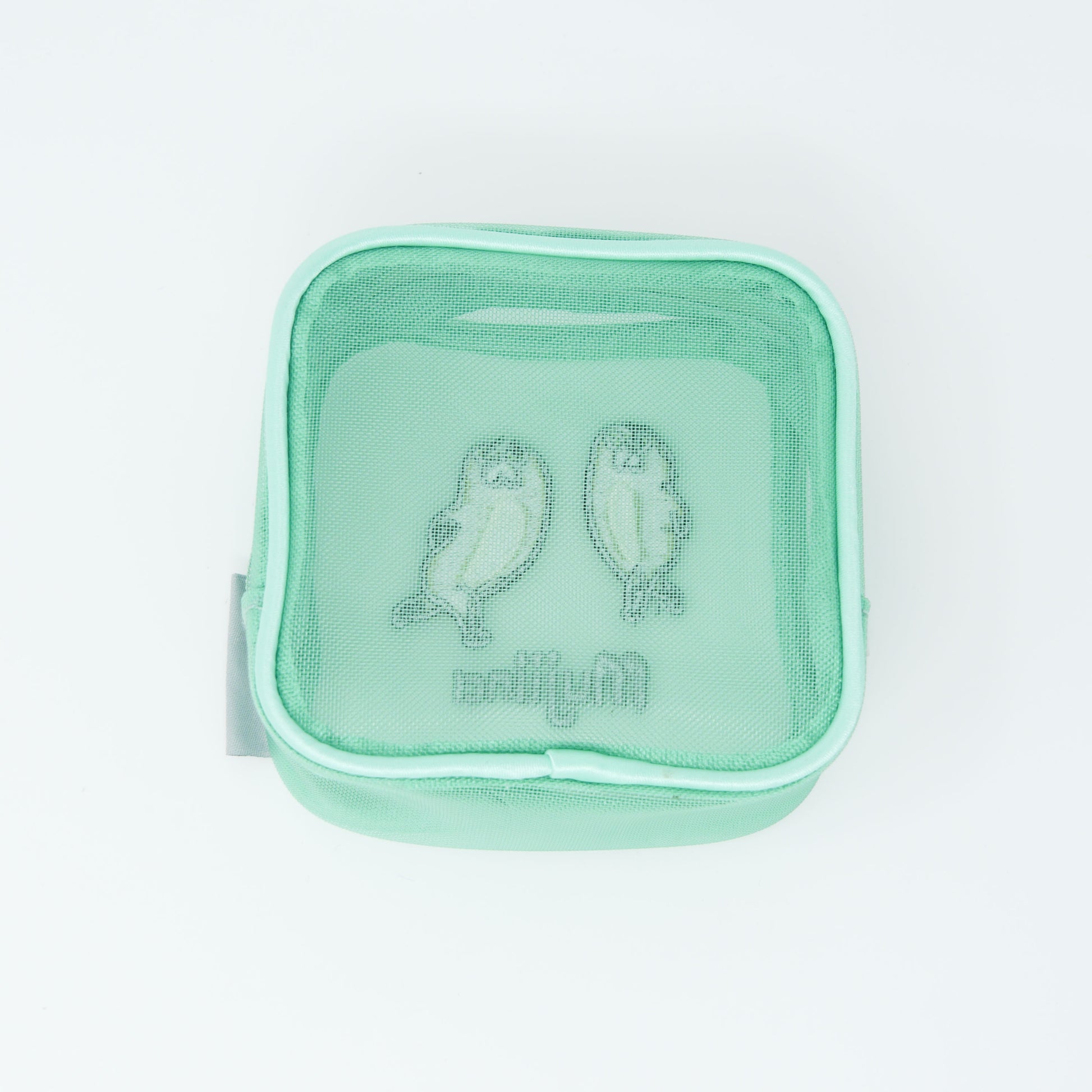 人気キャラクター「ムジーナ」が刺繍された、爽やかなグリーンのメッシュポーチです。