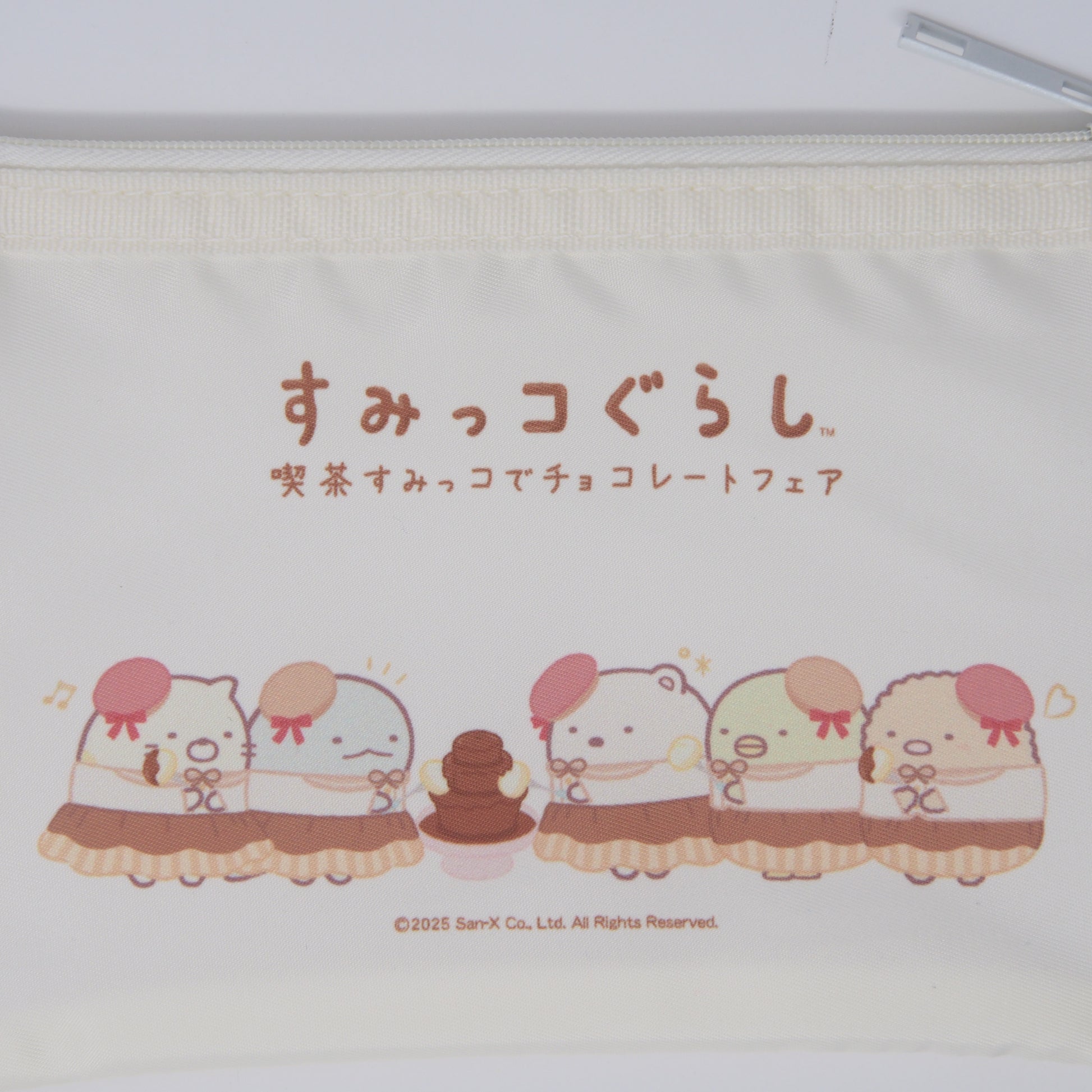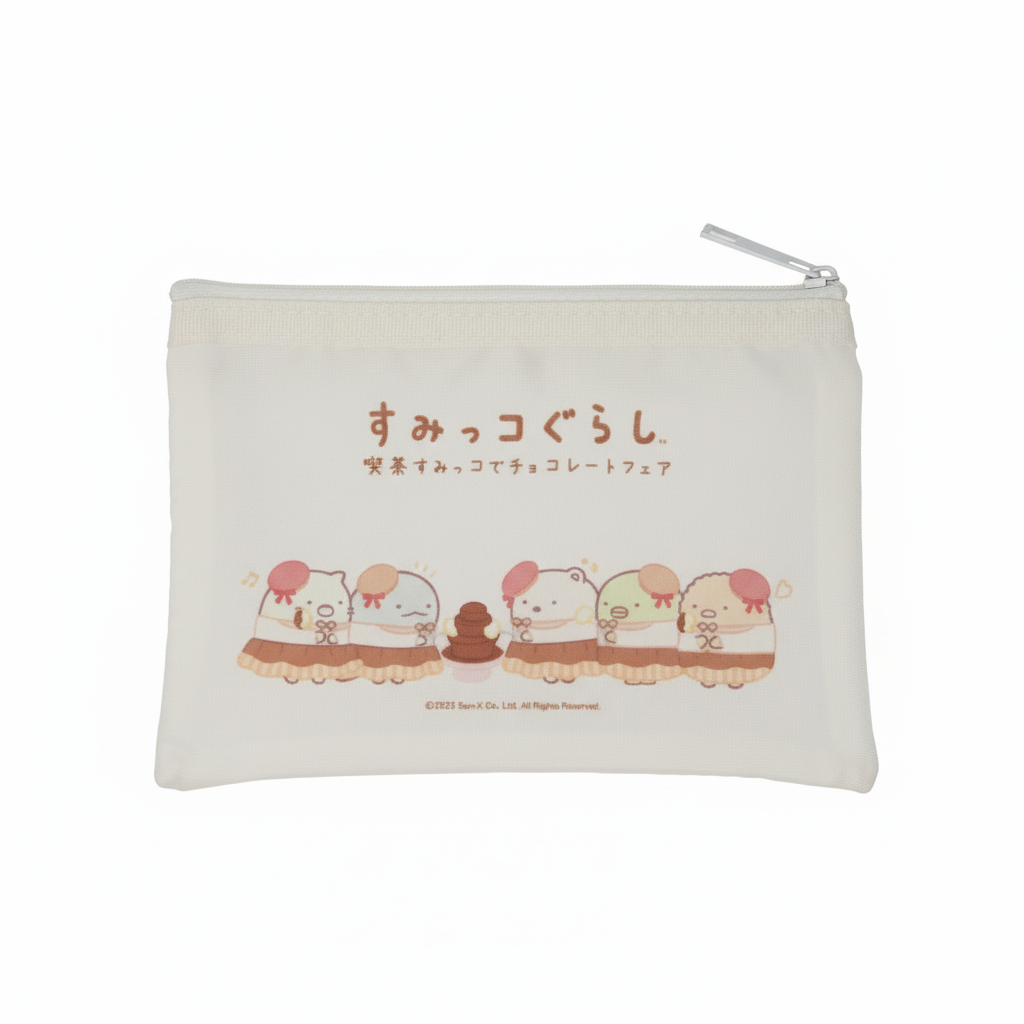 しろくま、ぺんぎん?、とんかつなど、おなじみのすみっコたちが、チョコレートスイーツのような姿になって可愛らしく整列しています。淡いクリーム色の生地に、落ち着いたブラウン系の色合いが、大人でも使いやすい雰囲気です。