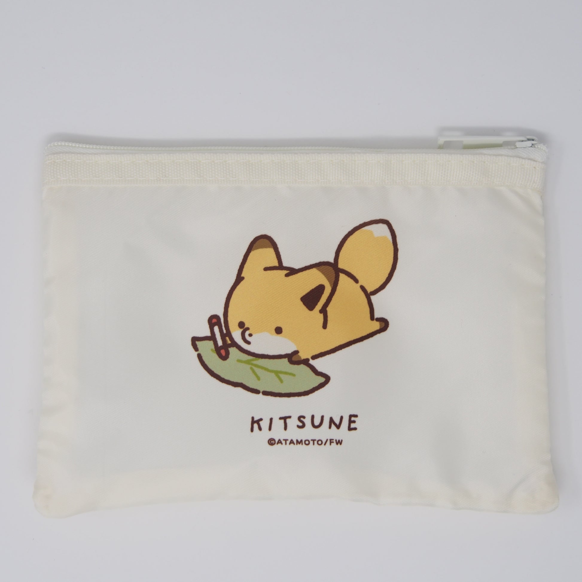 コミカルで可愛いキツネのイラスト入りフラットポーチ。コスメや充電コード、文具などの整理に大活躍します。薄型でかさばらず、バッグの中の整理整頓に便利です!